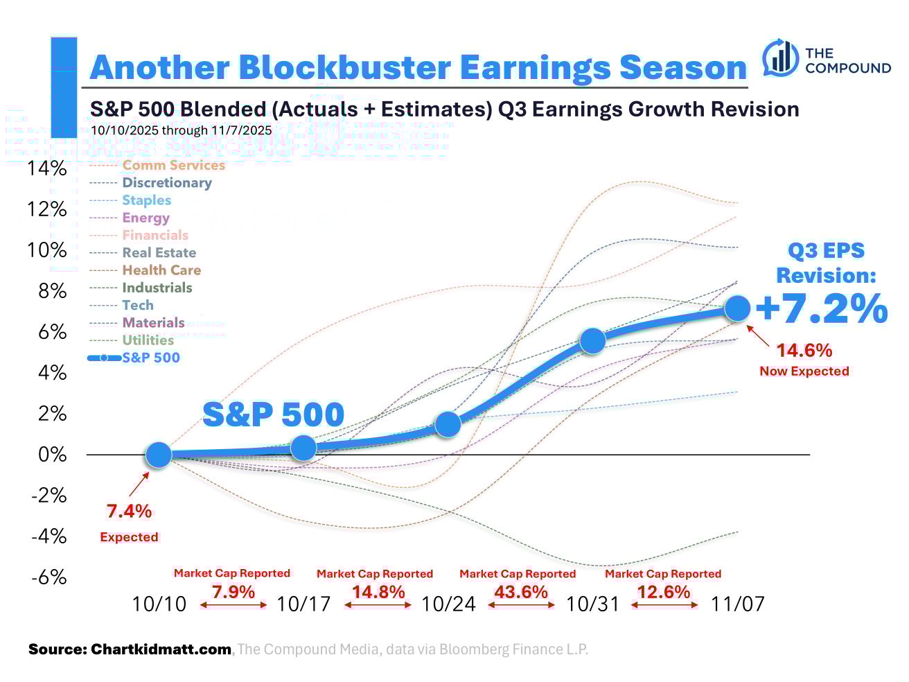 90% of the S&P 500’s market cap has reported and analysts expect S&P 500 profits will now grow 14.6% year-over-year in Q3.