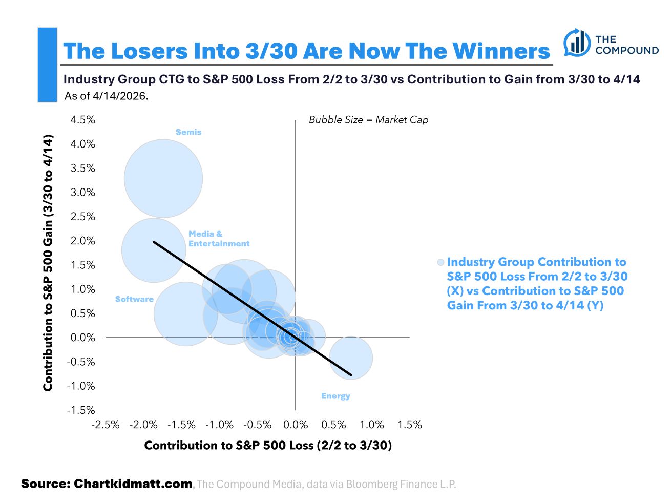 The chart shows the industry groups contributing to the S&P 500’s loss from 2/2 to 3/30 along the X axis and along the Y axis it’s showing how those same groups are now contributing to the gain since the 3/30 short-term low.